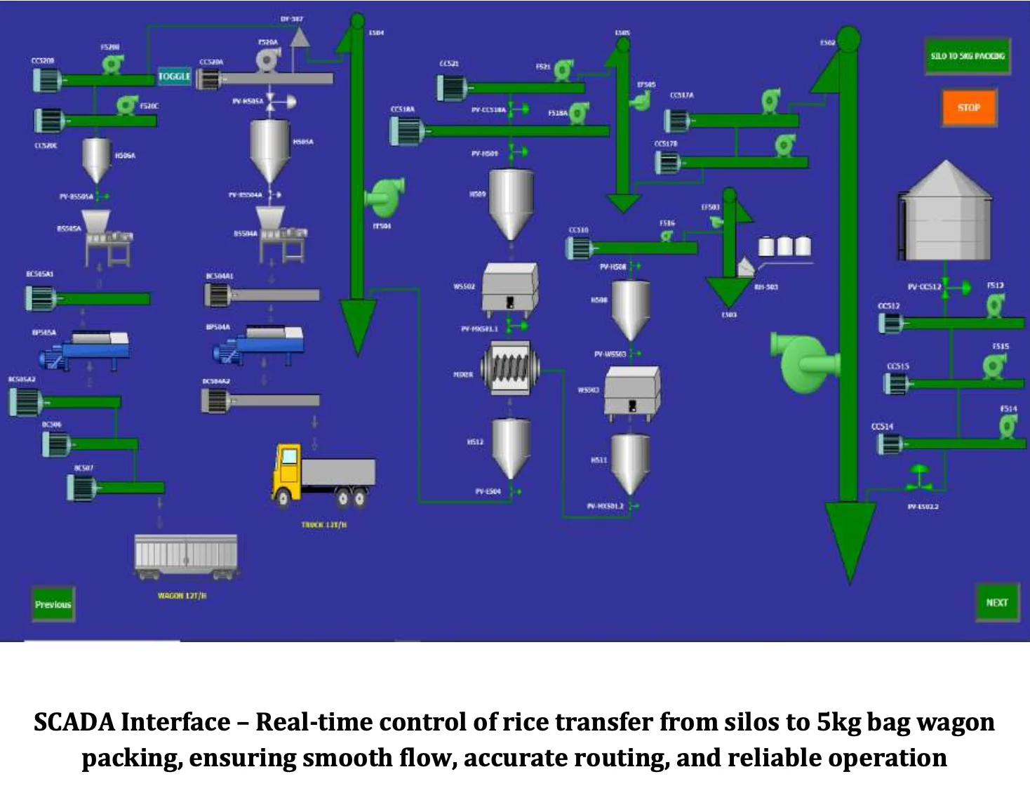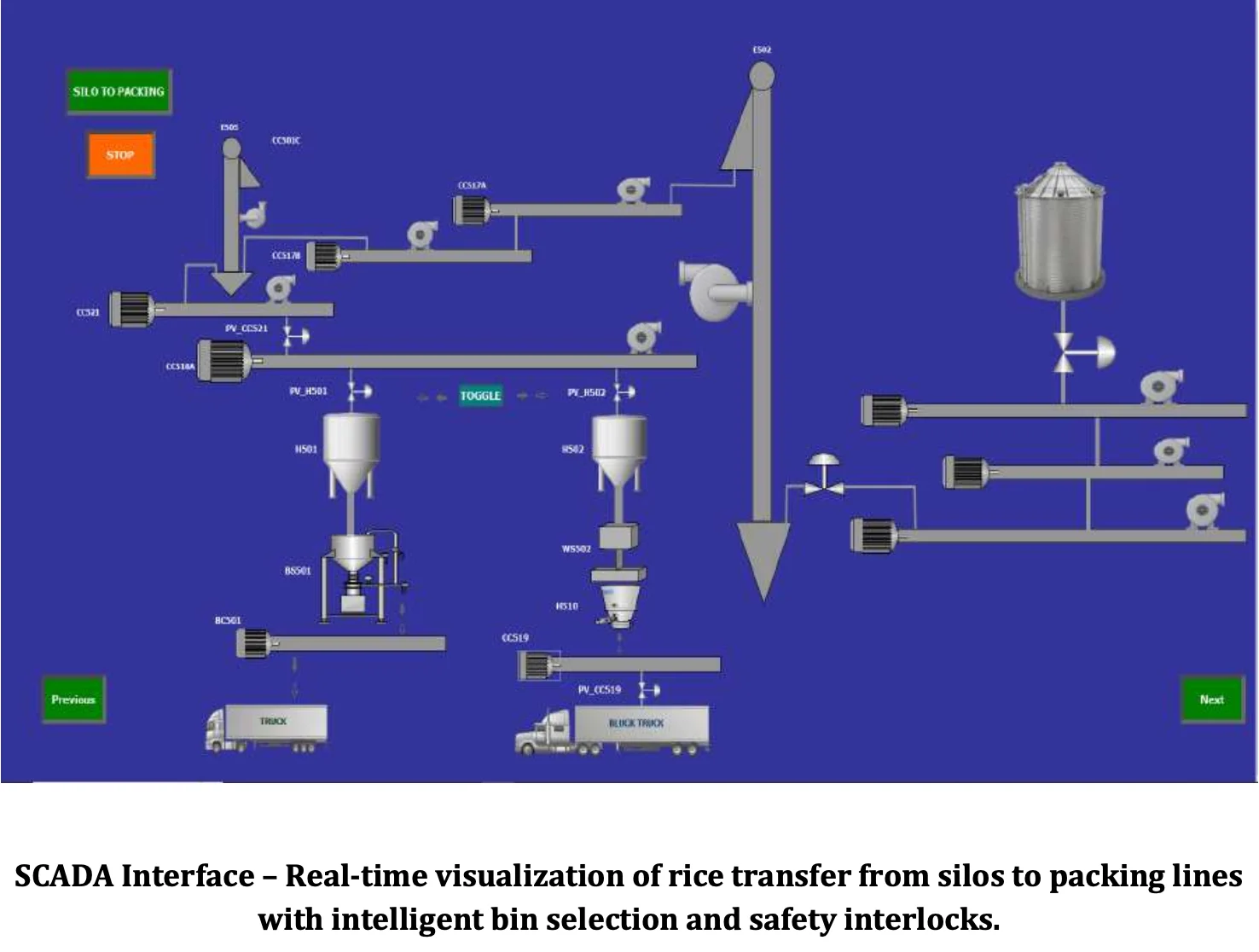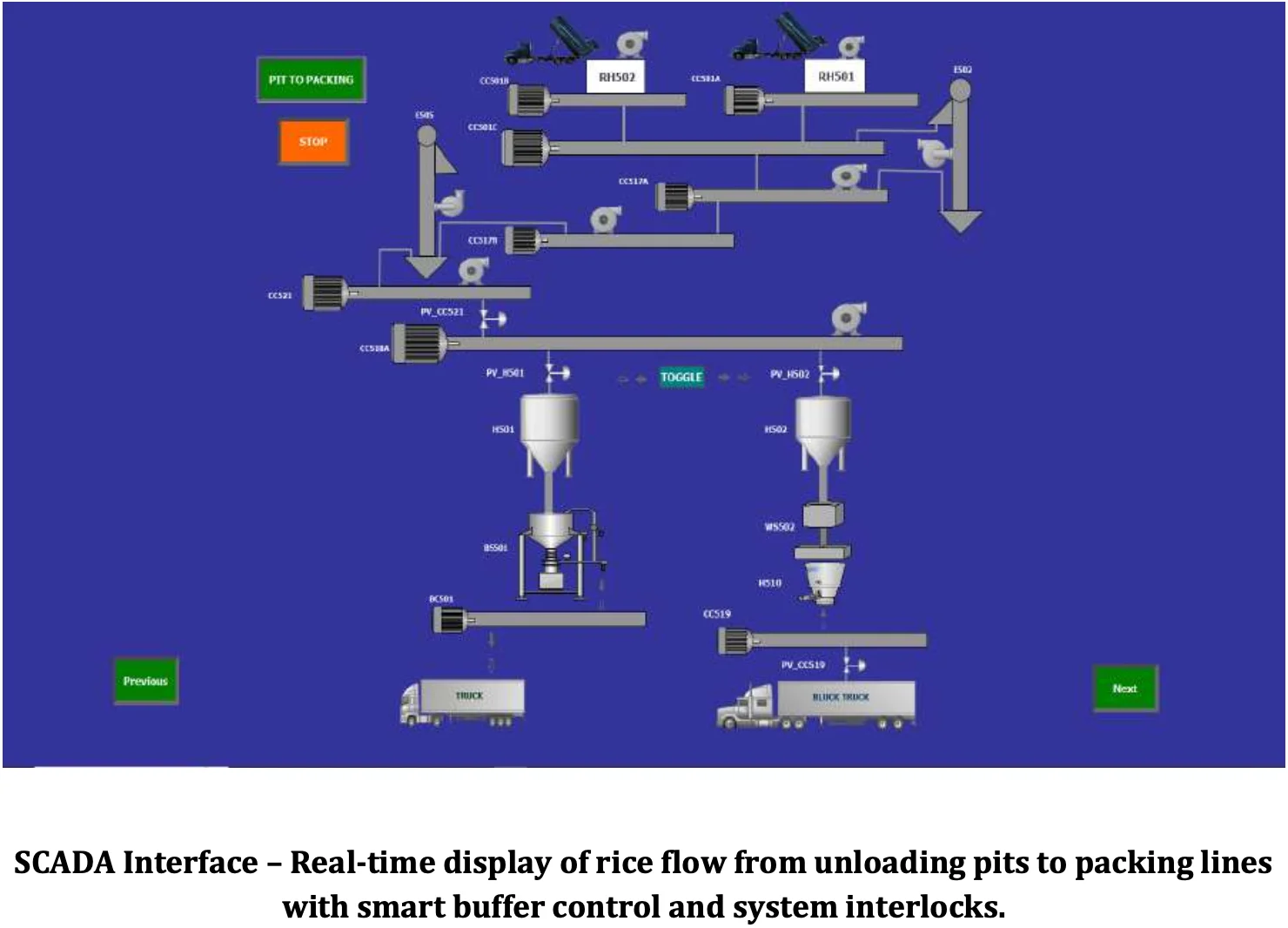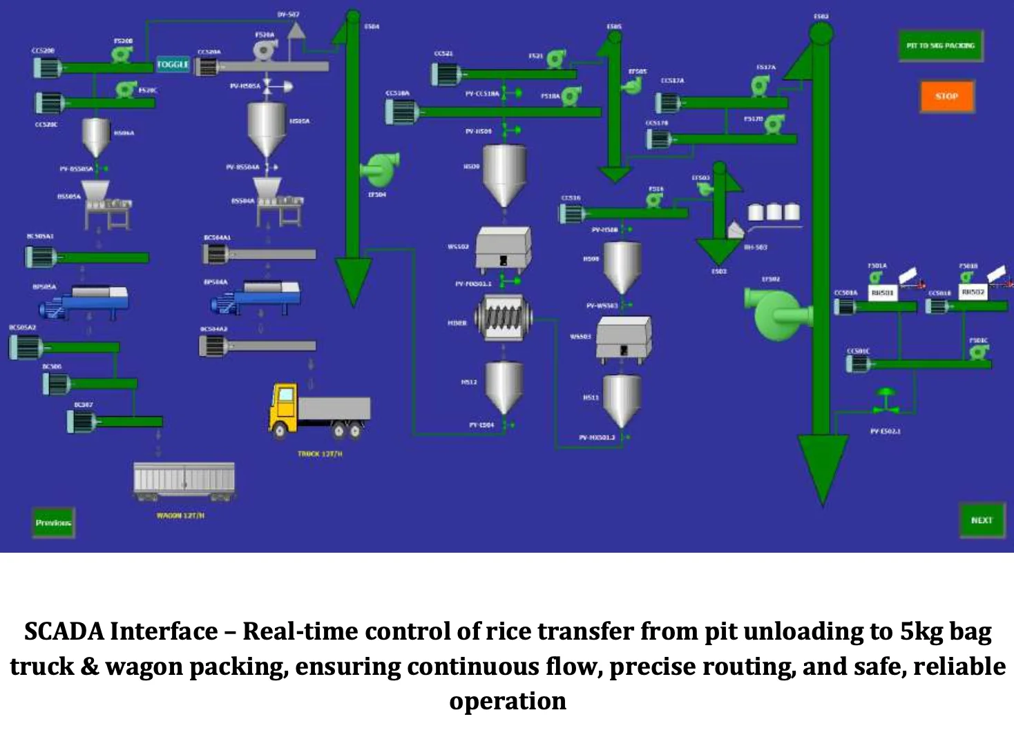 Implemented a fully automated, high-capacity, and safety-compliant grain handling system, enabling stable 24/7 operation and efficient bulk and packing workflows in line with government standards.