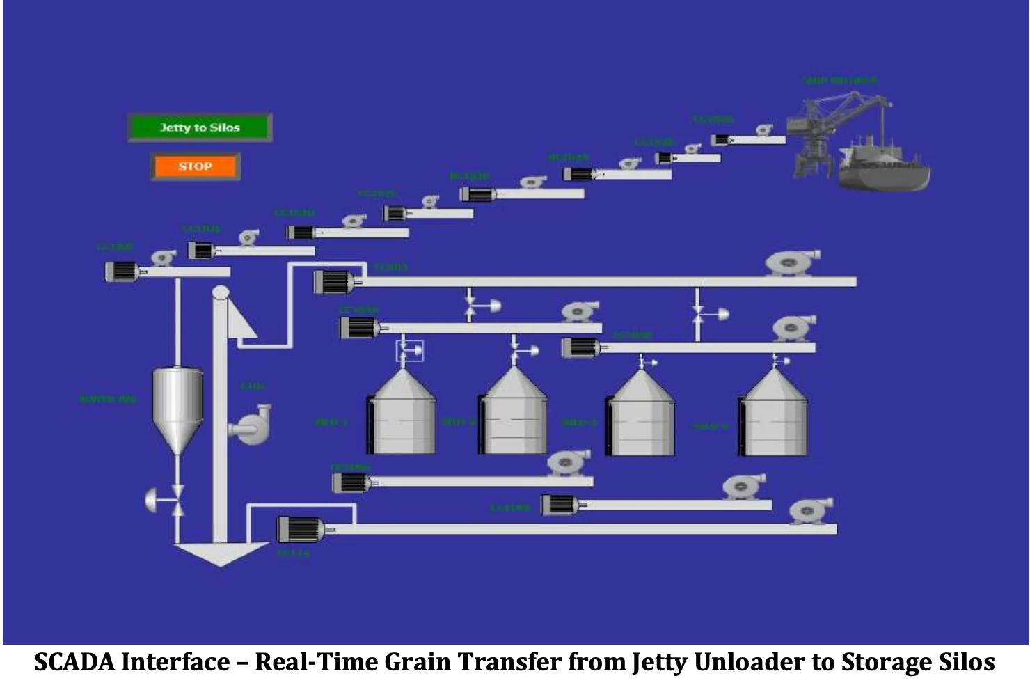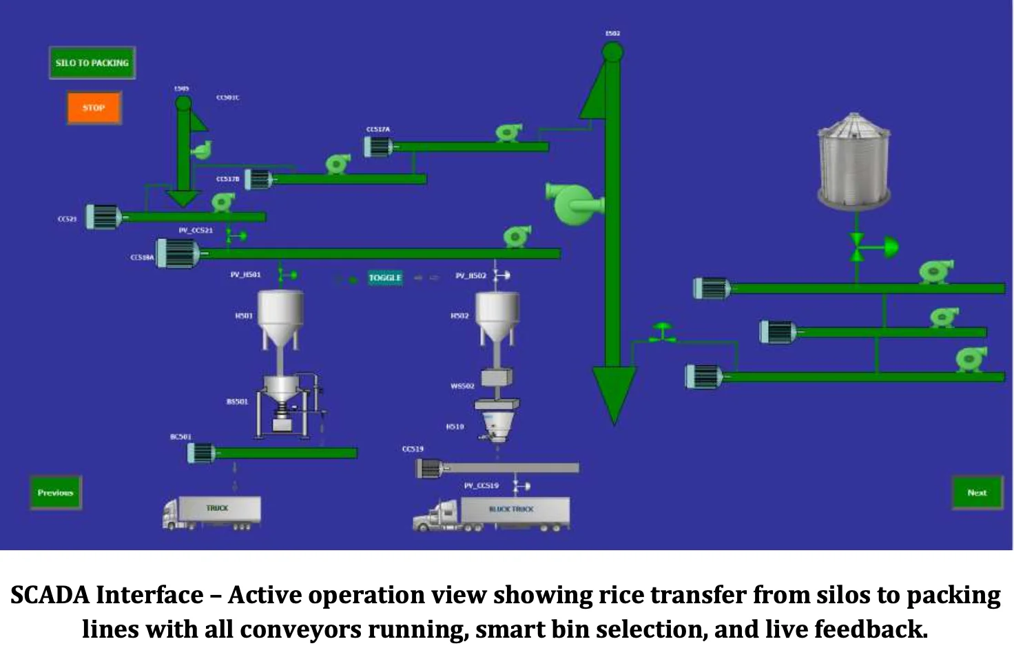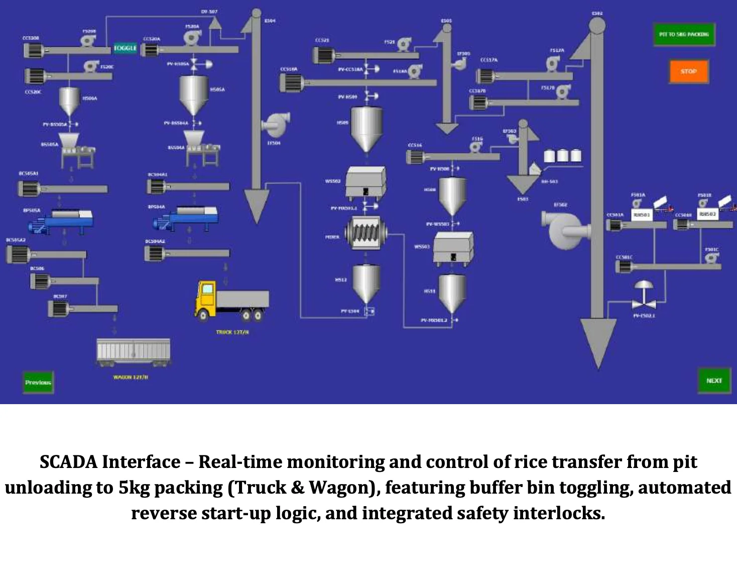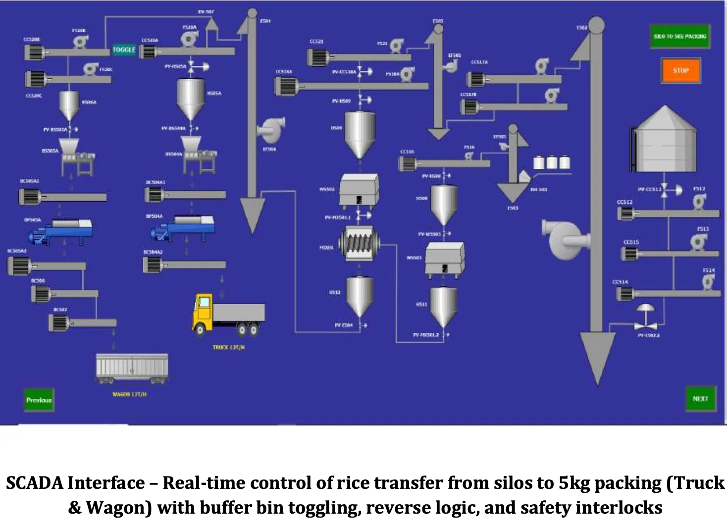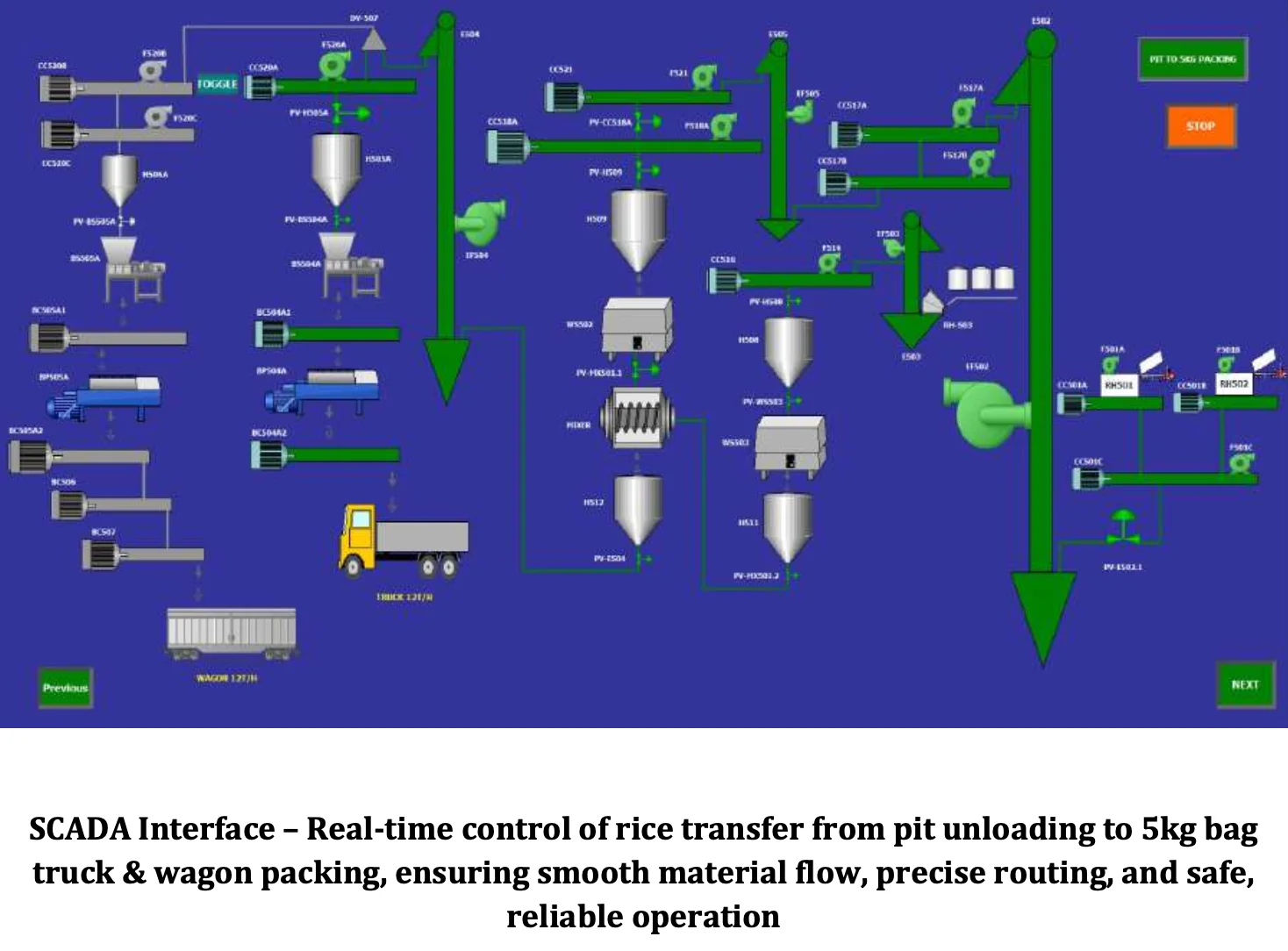Implemented a fully automated, high-capacity, and safety-compliant grain handling system, enabling stable 24/7 operation and efficient bulk and packing workflows in line with government standards.