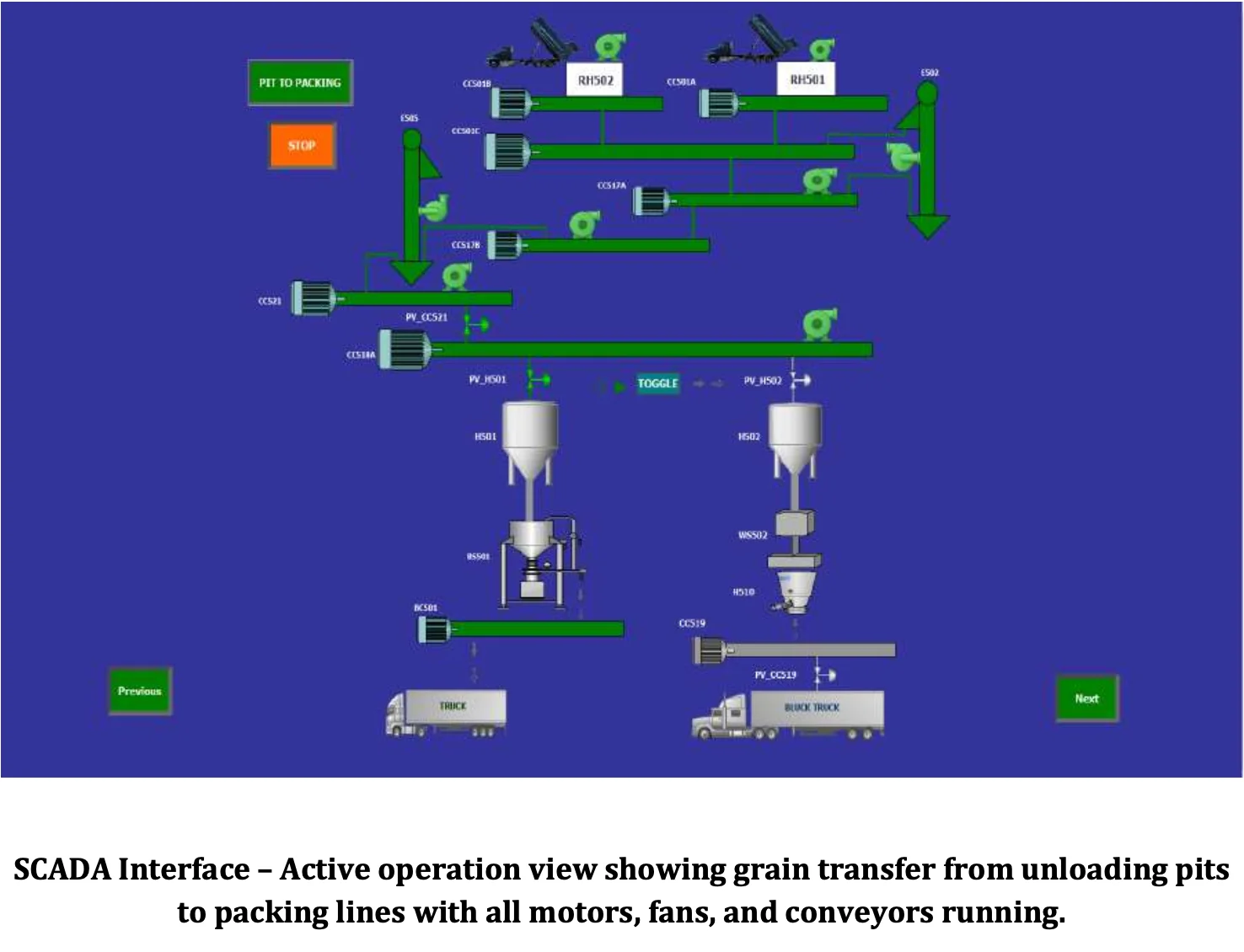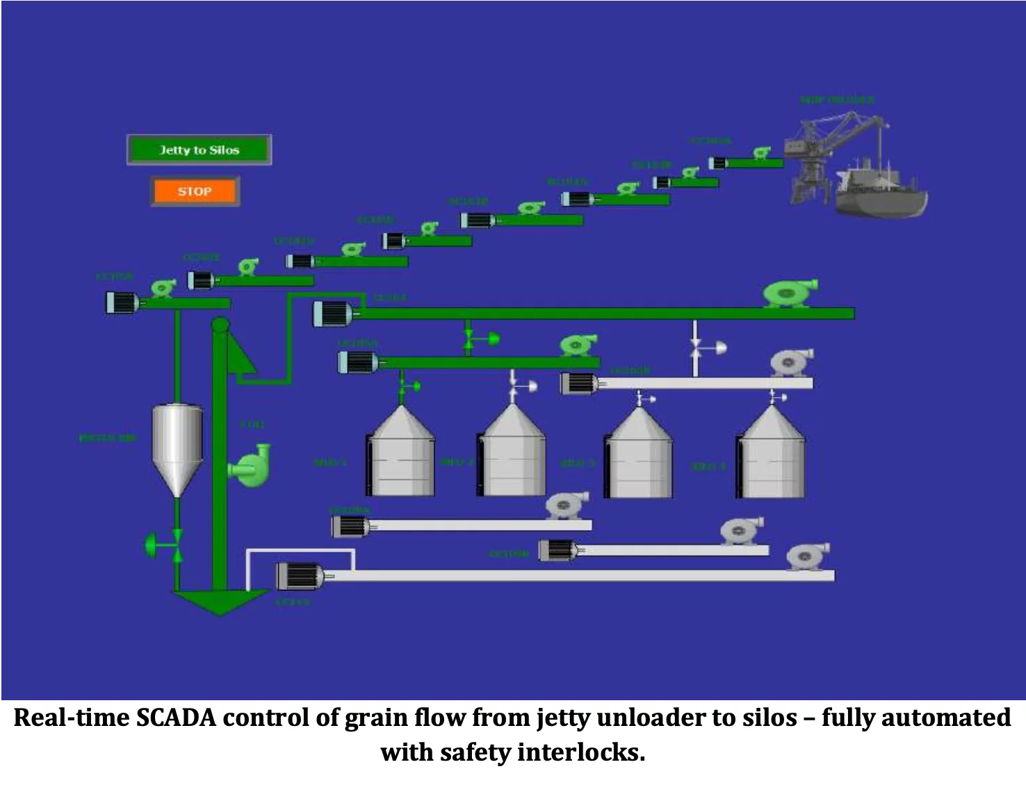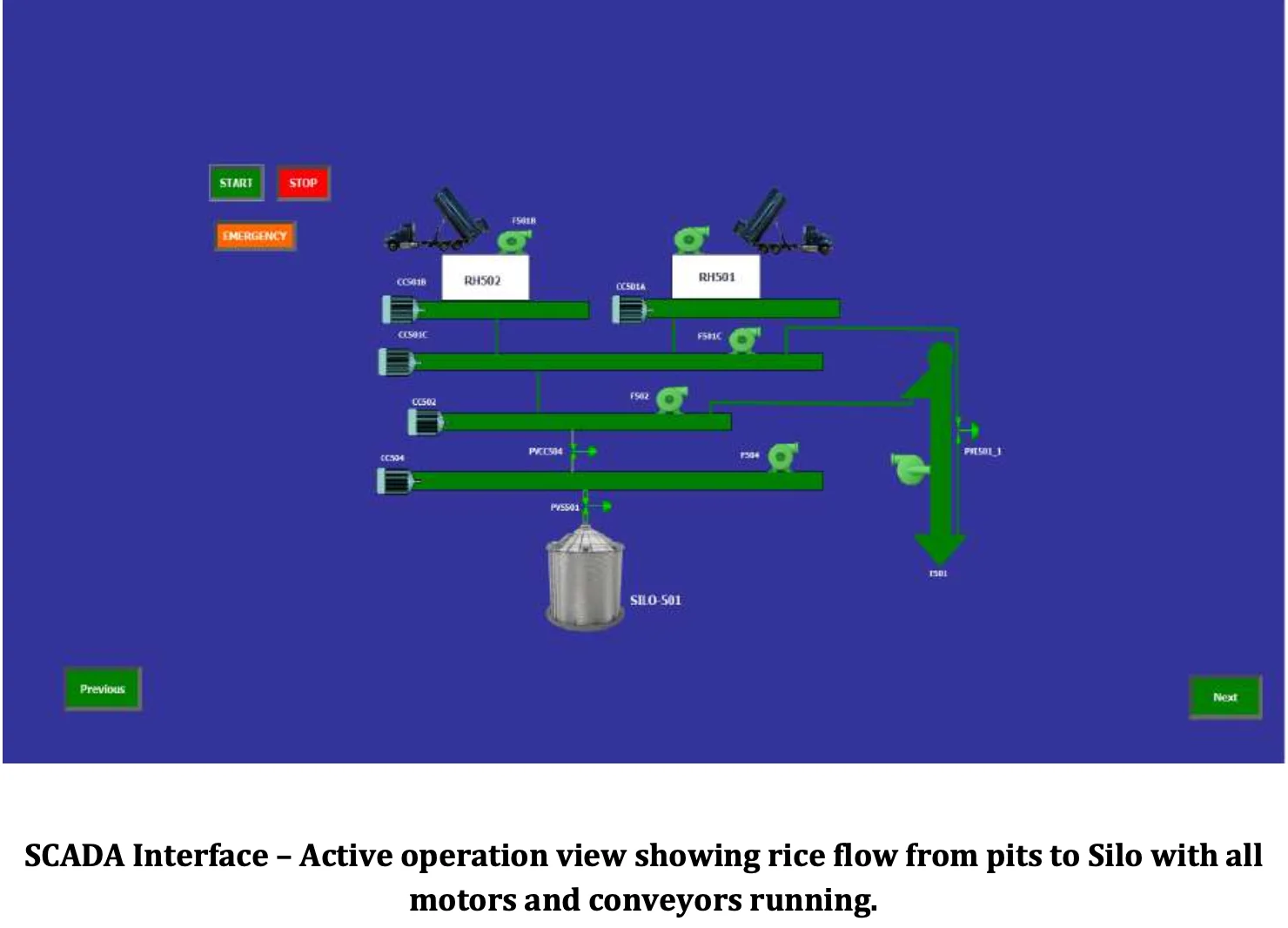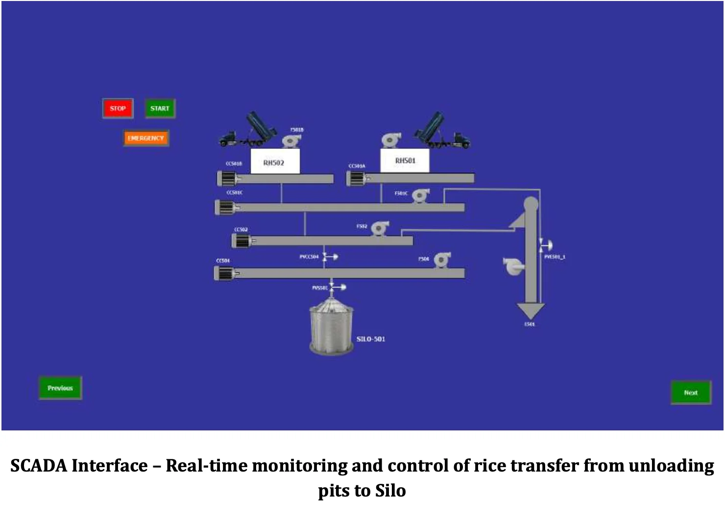 Implemented a fully automated, high-capacity, and safety-compliant grain handling system, enabling stable 24/7 operation and efficient bulk and packing workflows in line with government standards.